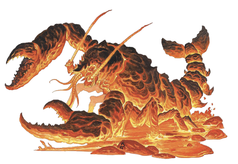 The Vorthropod is a lava lobster. It is one of those fantastically unique and weird monsters from Kobold Press, and it has a clear puzzle element in its stat block. The Vorthropod has two states: molten and hardened. When it is outside of lava for too long, its shell hardens. While hardened it becomes slower, its AC increases and it gains vulnerability to bludgeoning damage. It becomes molten again if it touches lava or takes fire damage. While molten touching the Vorthropod means taking fire damage.